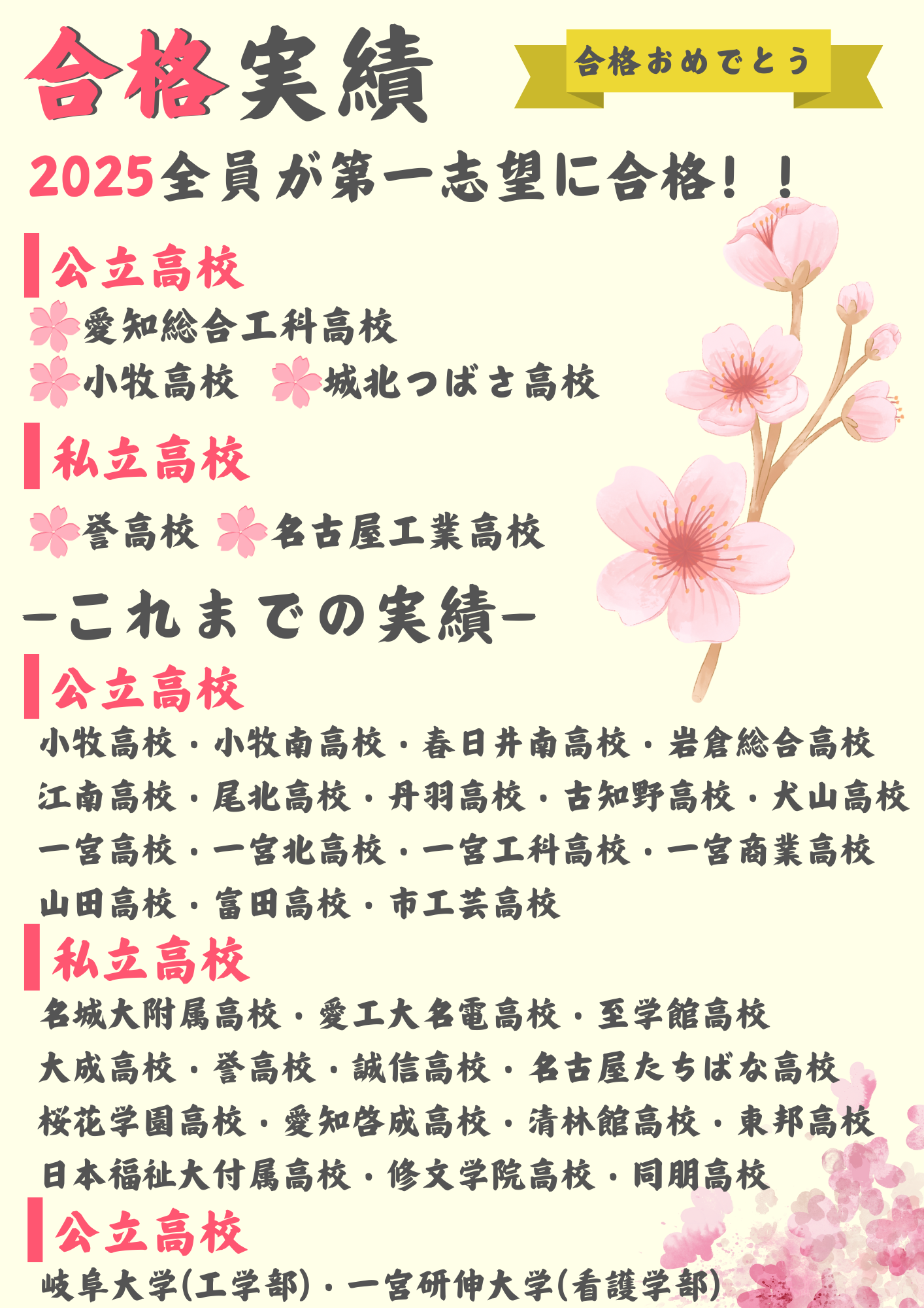 はじめまして、イー・デイズ小牧校の林直輝です。 勉強をできない、しない子どもたちをたくさん見てきました。そんな子どもたちに「テストでいい点数取れるようになりたい?」と聞いてみると、みんな決まって「いい点数が取りたい!」と答えてくれます。勉強が嫌だ嫌だという生徒も、心の底では「勉強ができるようになりたい」という思いを持っているものです。勉強ができるようになる姿を思い描けるように、そして、そうなれるように、一人ひとりにあった勉強の仕方からサポートいたします。「できた!」という喜びの瞬間をみなさんと味わえることをお待ちしております。合格実績